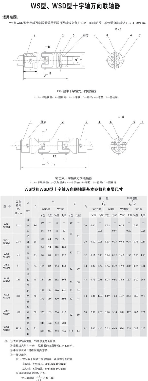 WS/WSD型十字軸式萬向聯(lián)軸器特點:使用于聯(lián)結空間同一平面上兩軸線夾角β≤45°的傳動場合?煞譃閱问中汀㈦p十字型、可伸縮型和法蘭型。具有傳遞扭矩大,使用壽命長,應用范圍廣等特點。它的應用特別是對冶金行業(yè)的技術改造及機械產(chǎn)品更新?lián)Q代提供了在有利條件。中間采用方塊體加滑動軸承可傳遞大扭矩,采用滾針軸承可提高轉速,理論達到4000轉/分鐘。特殊設計更可達到10000轉/分鐘。
